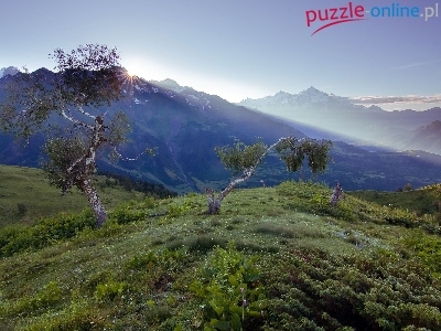 Puzzle Promienie, Góry, Drzewa, Słońca