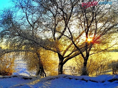 Promienie, Zima, Rzeka, Drzewa, Słońca