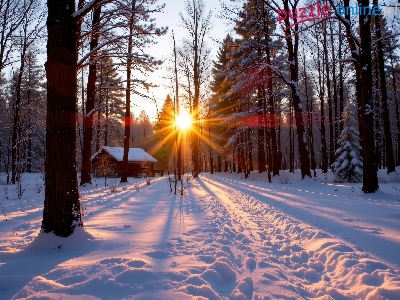 Promienie słońca, AI, Dom, Śnieg, Ścieżka, Drzewa, Zima, Las