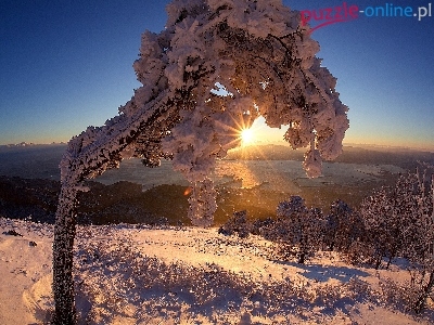 Drzewa, Promienie słońca, Zima, Wzgórze, Zachód słońca
