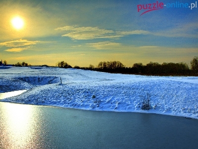 Promienie, Pola, Zima, Rzeka, Drzewa, Słońca