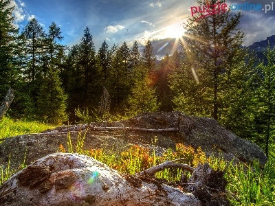 Promienie słońca, Drzewa, Las, Góry, Kamienie