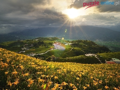 Promienie, Łąki, Panorama, Pola, Góry, Słońca