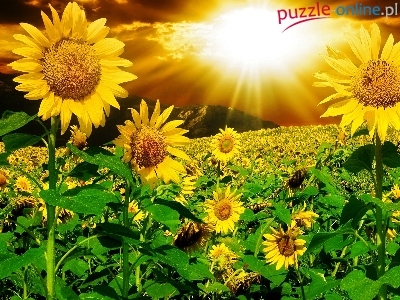 Puzzle Promienie, Słoneczniki, Góry, Słońca