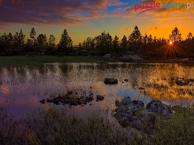 Kamienie, Promienie słońca, Rzeka, Drzewa, Zachód słońca