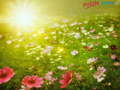 Puzzle Promienie, Łąka, Kwiaty, Słońca
