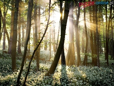 Kwiaty, Promienie słońca, Las, Drzewa, Czosnek niedźwiedzi