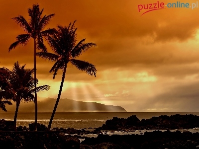 Puzzle Promienie Słońca, Chmury, Morze, Palmy