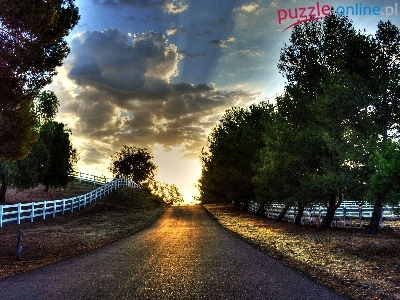 Puzzle Promienie, Droga, Ogrodzenie, Słońca