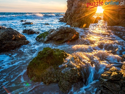 Puzzle Promienie, Morze, Skały, Słońca