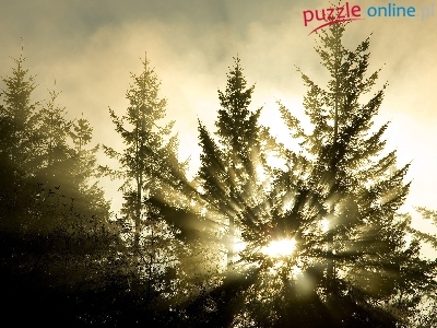 Puzzle Promienie, Drzewa, Świerki, Słońca