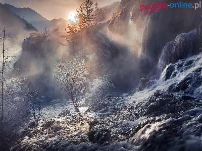 Puzzle Promienie słońca, Góry, Wodospad, Drzewa