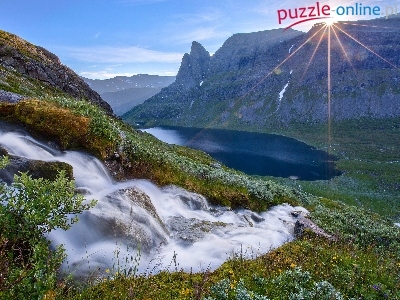 Puzzle Promienie, Góry, Wodospad, Słońca
