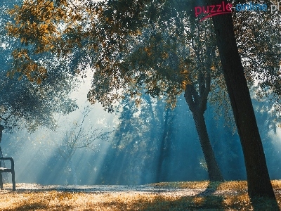Puzzle Przebijające światło, Jesień, Drzewa, Ławka