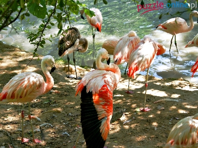 Puzzle Przebijające światło, Flamingi, Drzewo, Woda