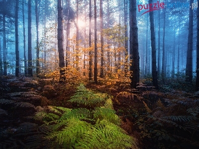 Przebijające światło, Paprocie, Jesień, Las, Drzewa