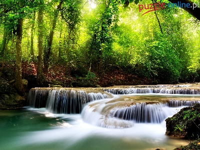 Puzzle Przebijające, Wodospad, Las, Światło