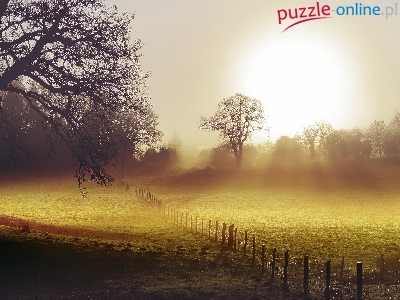 Przebijające, Drzewa, Pole, Mgła, Światło