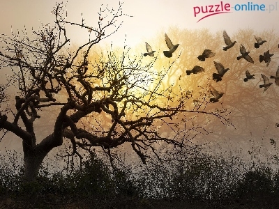 Puzzle Przebijające, Drzewo, Ptaki, Światło