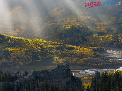 Jesień, Góry, Zalesione, Przebijające światło, Skały