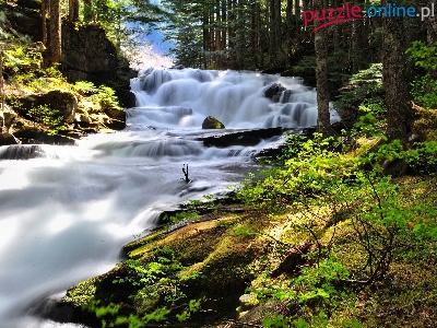 Puzzle Przebijające, Las, Wodospad, Światło