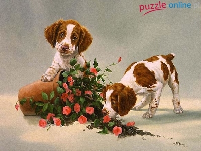 Przewrócona, Psy, Kwiaty, Dwa, Szczeniaki, Doniczka
