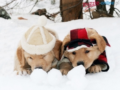 Psy, Golden Retriever, Zima, Åšnieg, Szczeniaki