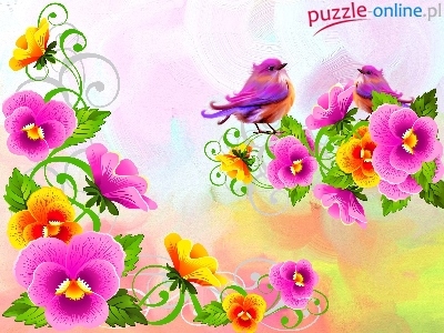 Puzzle Ptak, Kwiaty, Bratki, Rysunek