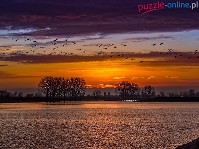 Ptaki, Lasy, Słońca, Jezioro, Drzewa, Zachód