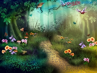 Puzzle Ptaki, Las, Kwiaty, Motyle