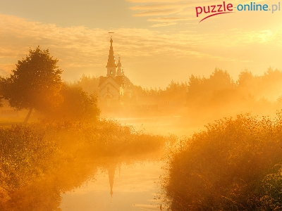 Petersburg, Staw Srednerogatsky, Mgła, Pulkovo Park, Zachód słońca, Rosja, Kościół św. Jerzego Zwycięskiego, Drzewa