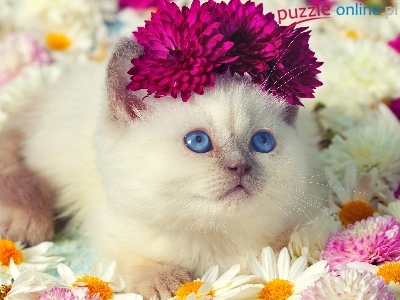 Ragdoll, Oczy, Kwiaty, Kot, Niebieskie