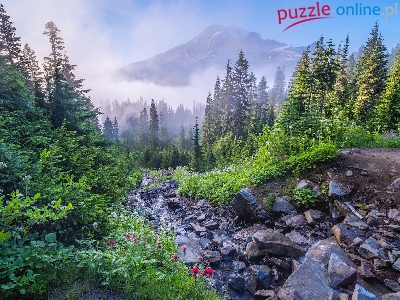 Mount Rainier, Waszyngton, Stany Zjednoczone, Park Narodowy Mount Rainier, Mgła, Kamienie, Kwiaty, Góra, Drzewa