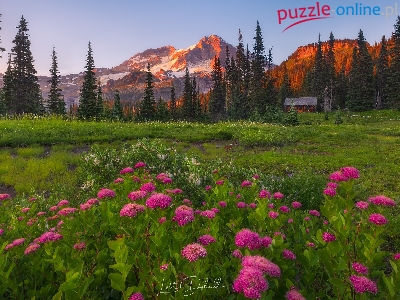 Kwiaty, Góry, Park Narodowy Mount Rainier, Tatoosh Range, Tawuła, Stan Waszyngton, Stany Zjednoczone, Łąka, Drzewa