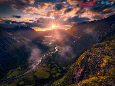 Norwegia, Góry, Dolina Romsdalen, Wschód słońca, Rzeka Rauma