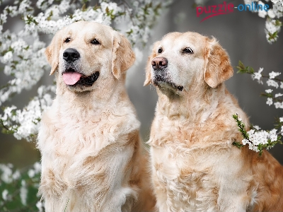 Psy, Dwa, Golden retriever, Kwiaty, Gałązki