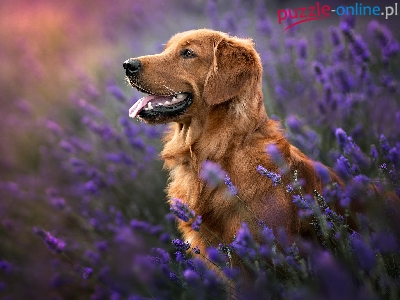 Pies, Język, Golden retriever, Lawenda, Kwiaty