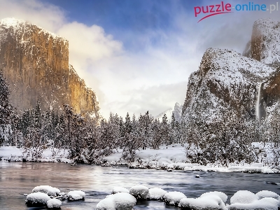 Śnieg, Zima, Park Narodowy Yosemite, Kalifornia, Merced River, Drzewa, Chmury, Kamienie, Góry, Rzeka, Stany Zjednoczone