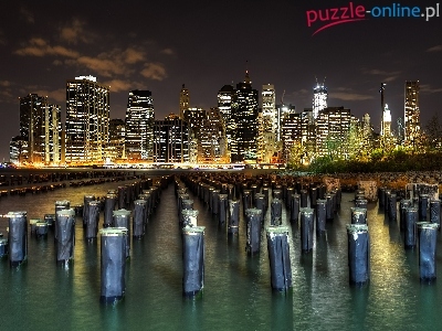 Cieśnina East River, Nowy Jork, Miasto nocą, Stany Zjednoczone, Manhattan, Wieżowce