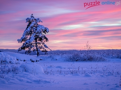 Region Värmland, Wschód słońca, Drzewo, Zima, Szwecja, Gmina Arvika, Ośnieżone