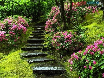 Rododendrony, Schodki, Park, Kwitnące, Kamienne