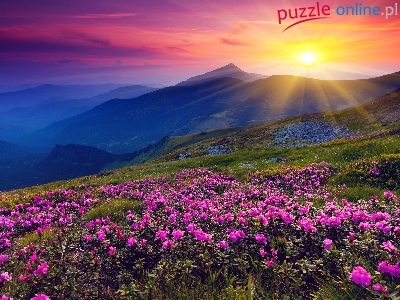 Puzzle Rododendrony, Góry, Zachód Słońca, Miniaturki