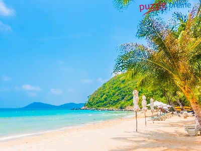 Roślinność, Lato, Palmy, Niebo, Parasole, Wybrzeże, Plaża, Wzgórza, Leżaki, Morze