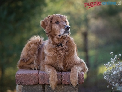Puzzle Rośliny, Golden retriever, Murek, Rozmyte tło