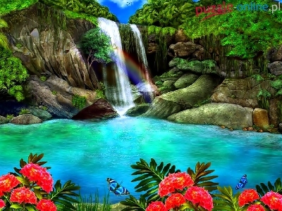 Rośliny, Skały, Kwiaty, Wodospad, Tęcza, Czerwone