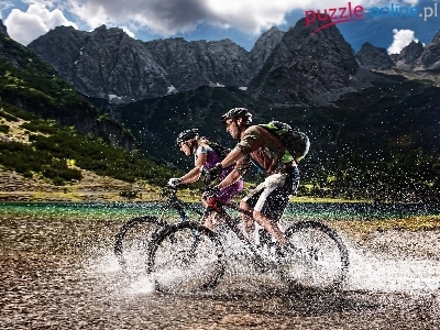 Puzzle Rowery, Góry, Turyści, Rzeka