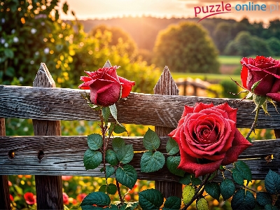 Zachód słońca, Czerwone, Róże, Kwiaty, Grafika, Płot