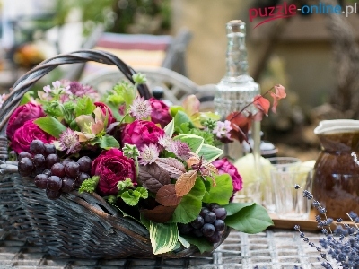 Kwiatowa, Róże, Herbata, Lawenda, Kompozycja, Winogrono, Kosz