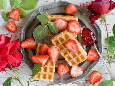 Róże, Łyżka, Gofry, Truskawki, Talerz