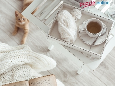 Podłoga, Filiżanka, Biel, Taca, Włóczka, Herbata, Kot, Kompozycja, Łyżeczka, Rozmycie